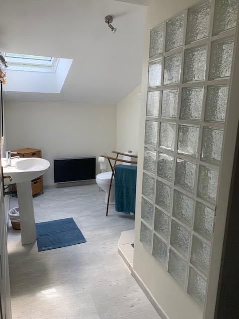 - 1 salle d’eau avec douche, lavabo, sèche-cheveux